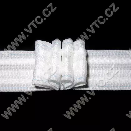 Regelmäßig Raffen vier-Falten Gardinenband mit einer Breite 26 mm. Nach dem Nähen und Falten legen der Vorhang mit Clips oder Haken, mit Bändern in die Taschen gewebt. Statt Naht wird verwoben mit Faden markiert. Faltenabstand 12 cm. Empfohlenes Verhältnis 1: 2. Tschechisches Produkt, Preis pro Meter.