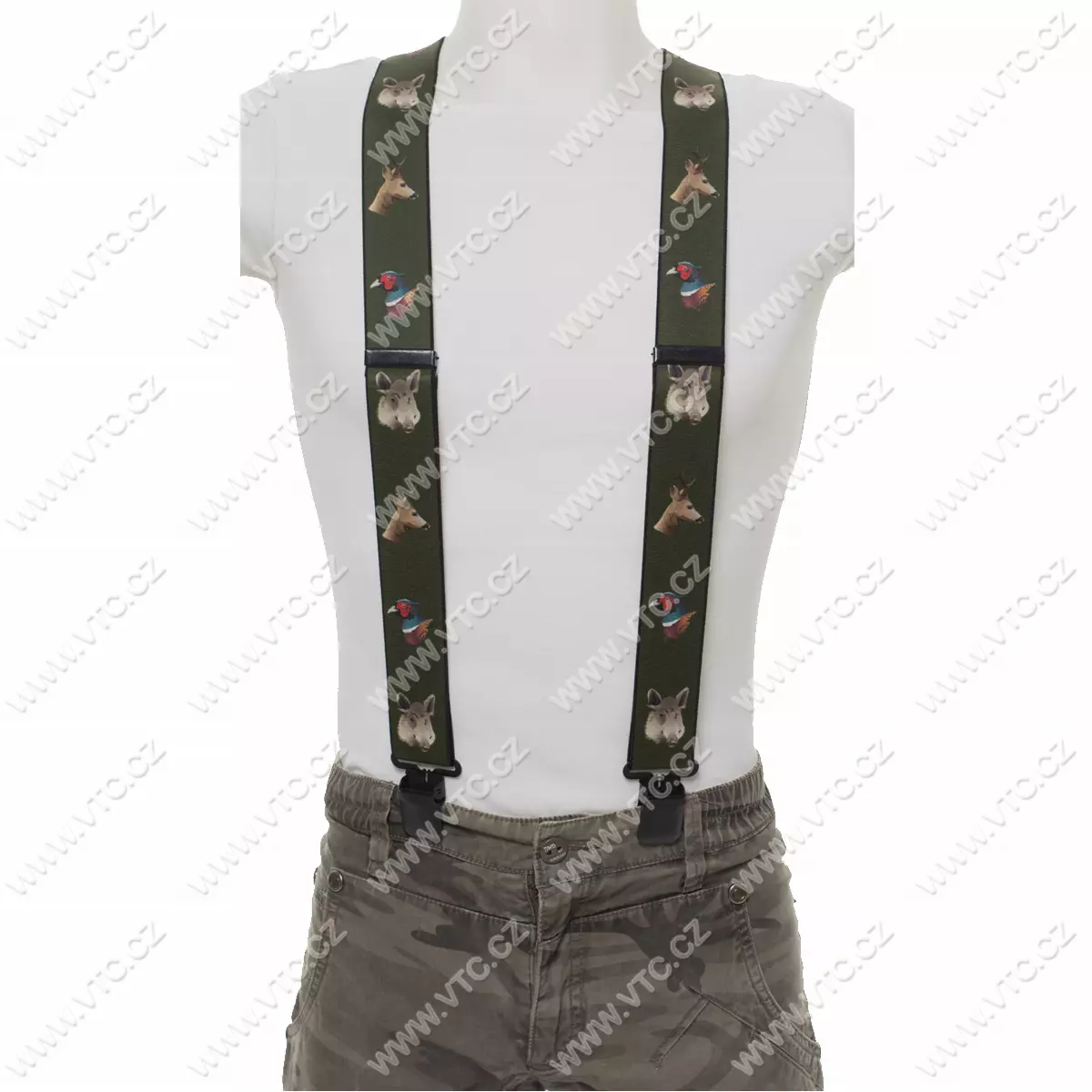 Fishermen's and hunters' clip-on braces, Y style back, 3 metal clips, width 4 cm. Generally fits people up to 180 cm. Length of unstretched braces 120 cm. Czech product, price for 1 pc.