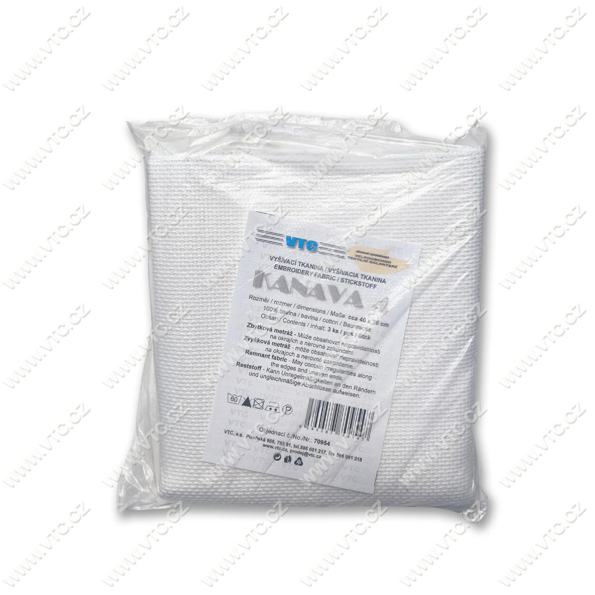 Vyšívací bavlněná tkanina, 4x4 vlákna, 41 oček na 10 cm. Zbytková metráž - může obsahovat nepravidelnosti na okrajích a nerovné zakončení. Obsahuje 3 ks o rozměrech cca 40x70 cm. Český výrobek, cena za 1 bal.