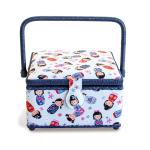 Großer rechteckiger Nähkorb für Aufbewahrung und Transport von Nähzubehör. Herausnehmbarer, transparenter Kunststoffeinsatz mit 7 Fächern, Tragegriff, Praktischer Magnetverschluss, Nadelkissen und Stofftaschen im Inneren des Deckels. Maße: 38,5x26x21 cm. Philippinisches Produkt, Preis pro 1 St.