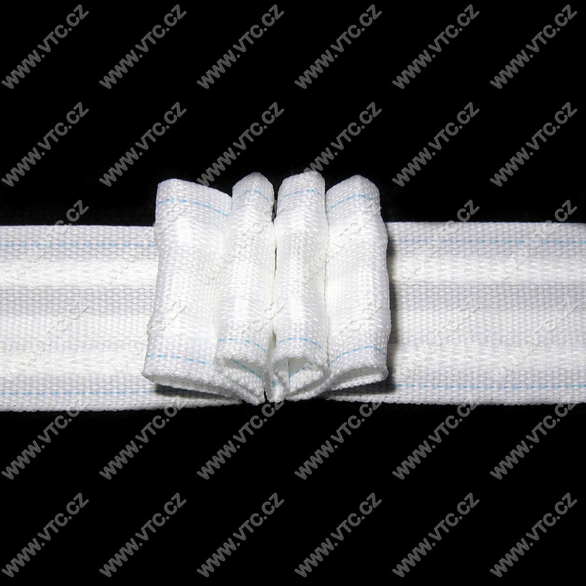 Regelmäßig Raffen vier-Falten Gardinenband mit einer Breite 26 mm. Nach dem Nähen und Falten legen der Vorhang mit Clips oder Haken, mit Bändern in die Taschen gewebt. Statt Naht wird verwoben mit Faden markiert. Faltenabstand 12 cm. Empfohlenes Verhältnis 1: 2. Tschechisches Produkt, Preis pro Meter.