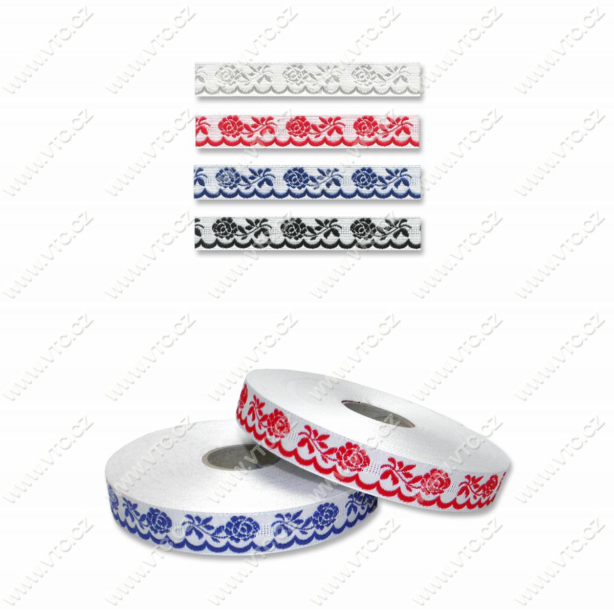Überbackene Jacquard-Band, Breite 20 mm, Aufmachung 25 m. Gerades band mit überbackene Muster gestickt. Tschechisches Produkt, Preis pro 1 m.