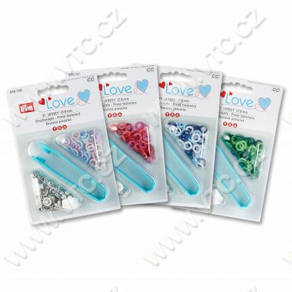 Kollektion Prym LOVE. Druckknöpfe JERSEY 8 mm, 21 St. auf der Karte, mit Anleitung und Zubehör. Es ist möglich mit dem mitgelieferten Produkt und einen Hammer angewendet, Zange Vario 39448 oder Dreifuss 39458. Deutsches Produkt, Preis pro 1 Karte.