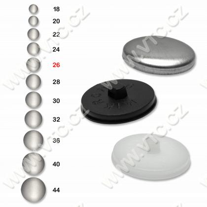 Überziehbare Knöpfe. Plastikunterseite und Aluminiumoberseite. Durchmesser 15,5 mm, 100 St. in Packung. Preis pro 1 St. Werkzeug auf Karte 87226, Handpresse auf Karte 87200.
