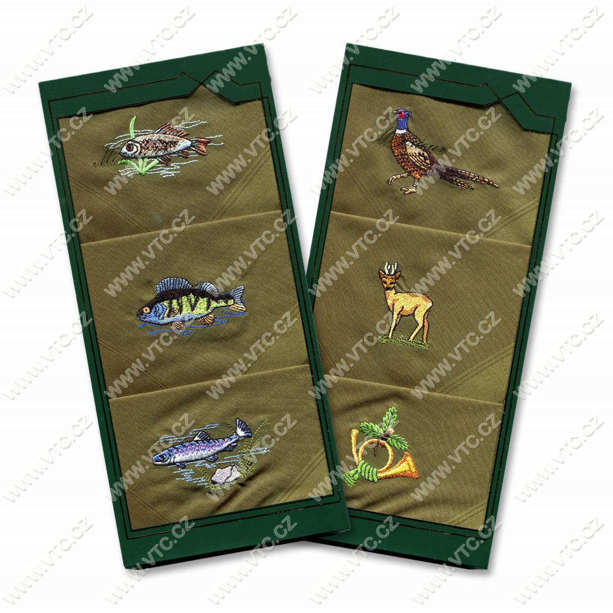 Herren Taschentuch, Gr. 40,5x40,5 cm, mit farbiger Stickerei (Jäger-, Fischermotiv), Kammbaumwolle, 3 St. im Schachtel. Tschechische Produkt, Preis pro 1 Schachtel.