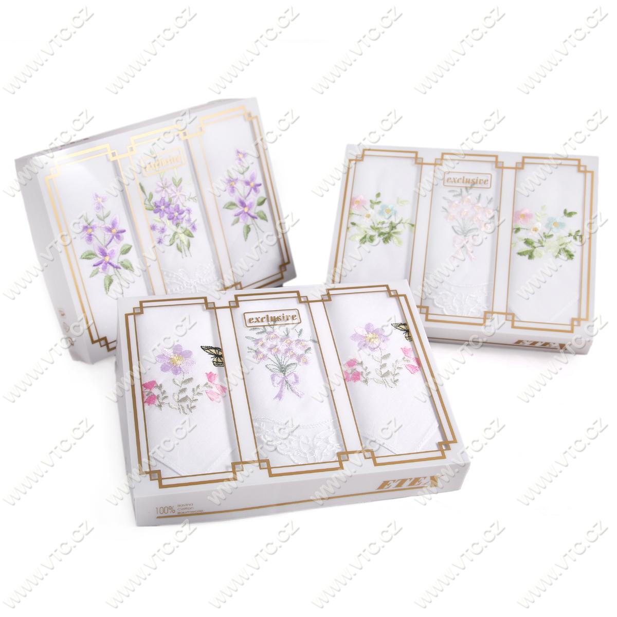 Damen Taschentuch, Gr. ca. 28x28 cm, mit farbiger Stickerei, 1 St. mit der Spitze, 3 St. in Schachtel. Tschechisches Produkt, Preis pro 1 Schachtel.