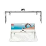 Angular bag fastening in polished metal with round fastener balls and two hooks for attaching metal chains. The pre-punched holes in the metal frames ensure an even sewing of the fabric to the bag fastening. Size 22,5 x 7,5 cm. German product, price for 1 pc.
