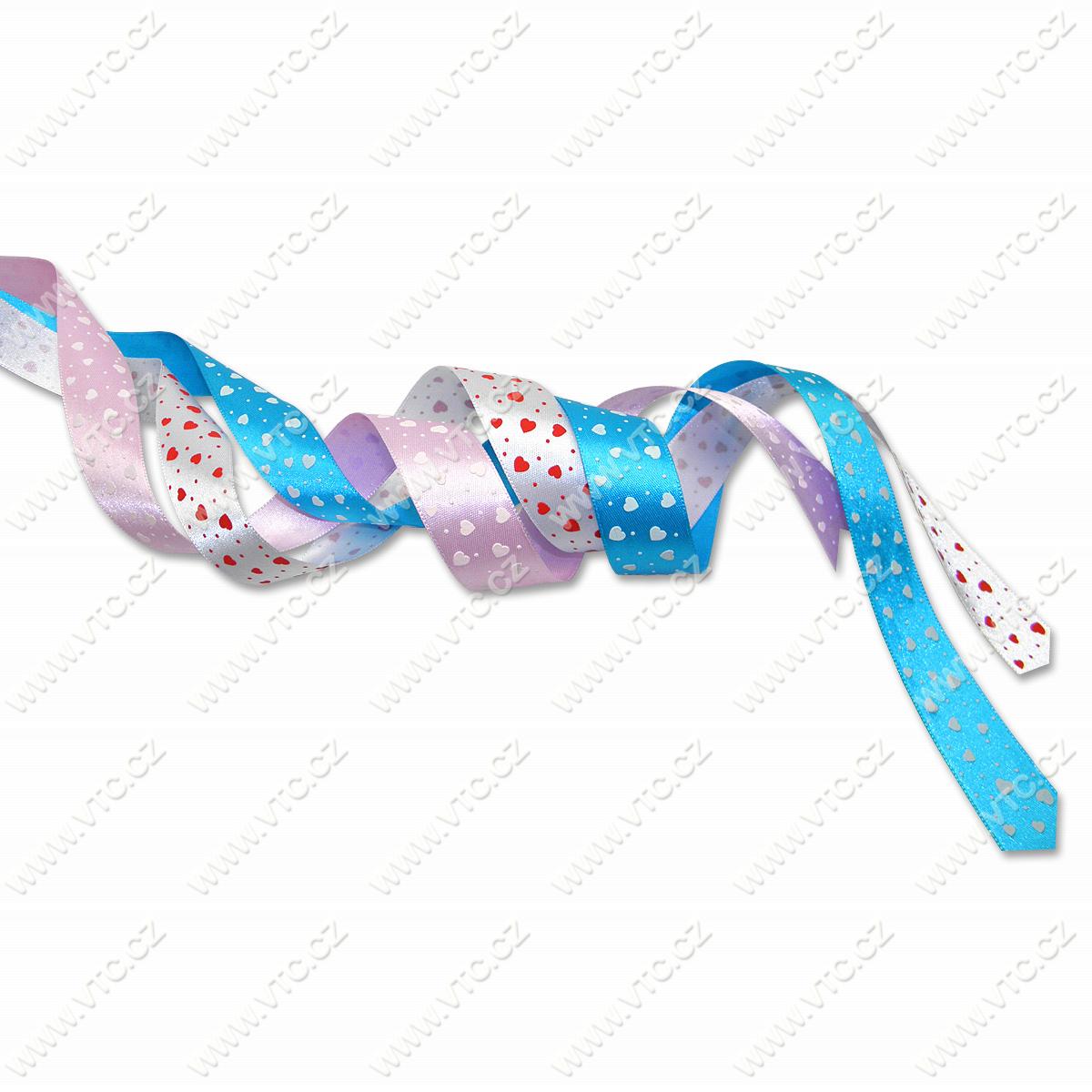 Fancy double-face satin ribbon, printed - hearts, width 24 mm, price for 1 piece, Czech product.