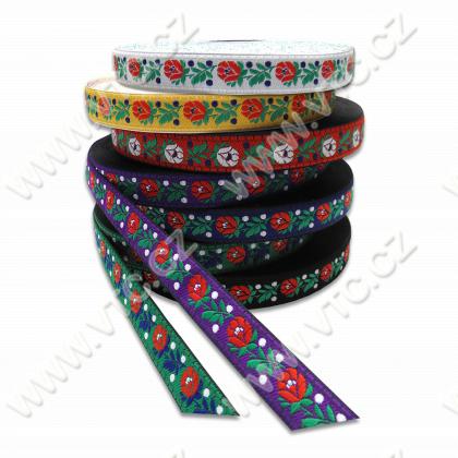 Embroidered folk costume ribbon with traditional floral design, width 18 mm, make-up 25 m. Czech product, price for 1 m.