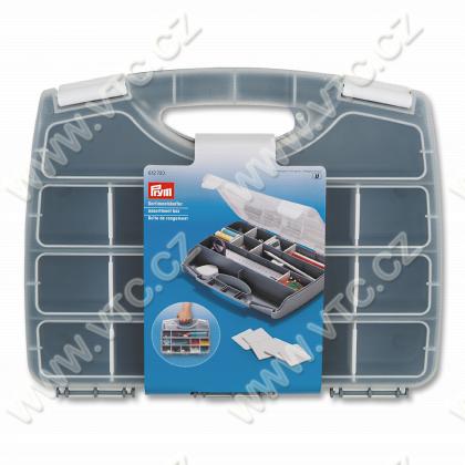 Plastic assortment box for sewing, hadicraft and hobby utensils. Variable partitioning by means of removable partitions. Dim. 316x260x60 mm. Without contents. Chinese product, price for 1 pc.