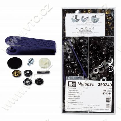 Press fasteners SPORT & CAMPING 15 mm, black nickel, 100 pcs/box (multipac) with instructions and accessories. Apply by enclosed tools and hammer, Vario pliers 39448 or tripod 39458. Italian product, price for 1 box.