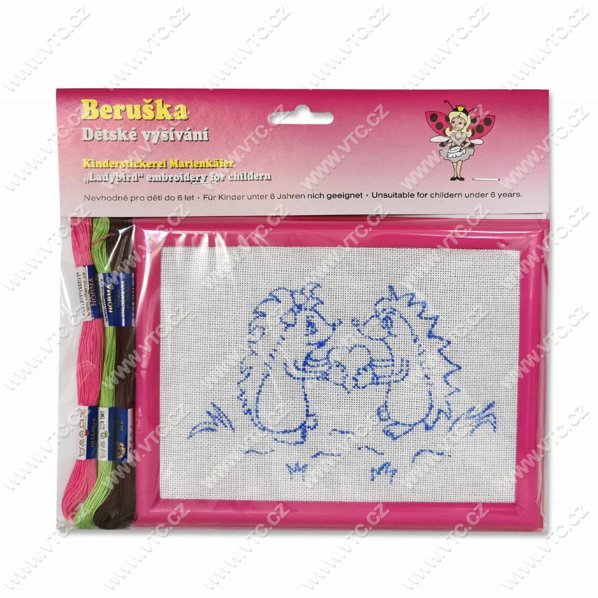 Embroidery set for children (printed canvas, embroidery yarn, needle, plastic frame 15x20 cm). Czech product, price for 1 set.