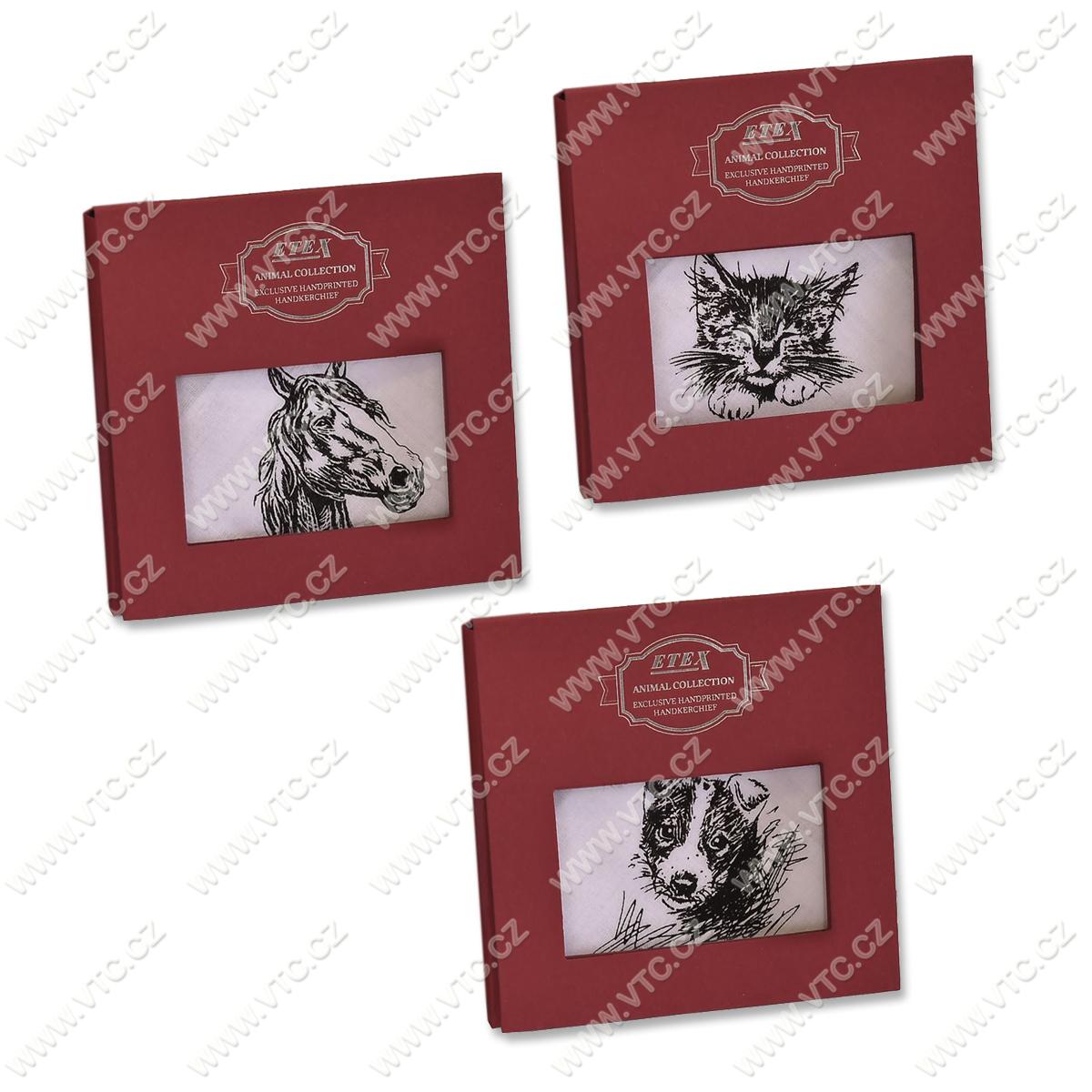 White ladies' handkerchiefs, hand printed, animal motives. Size approx. 30x30 cm, 100% cotton, 1 pc in gift box. Czech product, price for 1 box.