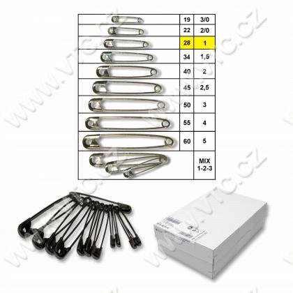 Safety pins, lenght 28 mm, 12 pcs/bunch on ring, 50 bunches/box (600 pcs). Czech product, price for 1 box.