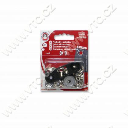 Clothing metal eyelets, rustproof brass, dim. 7x5x13 mm. 20 pcs/card, riveting and punch tools included! Czech product, price for 1 card.