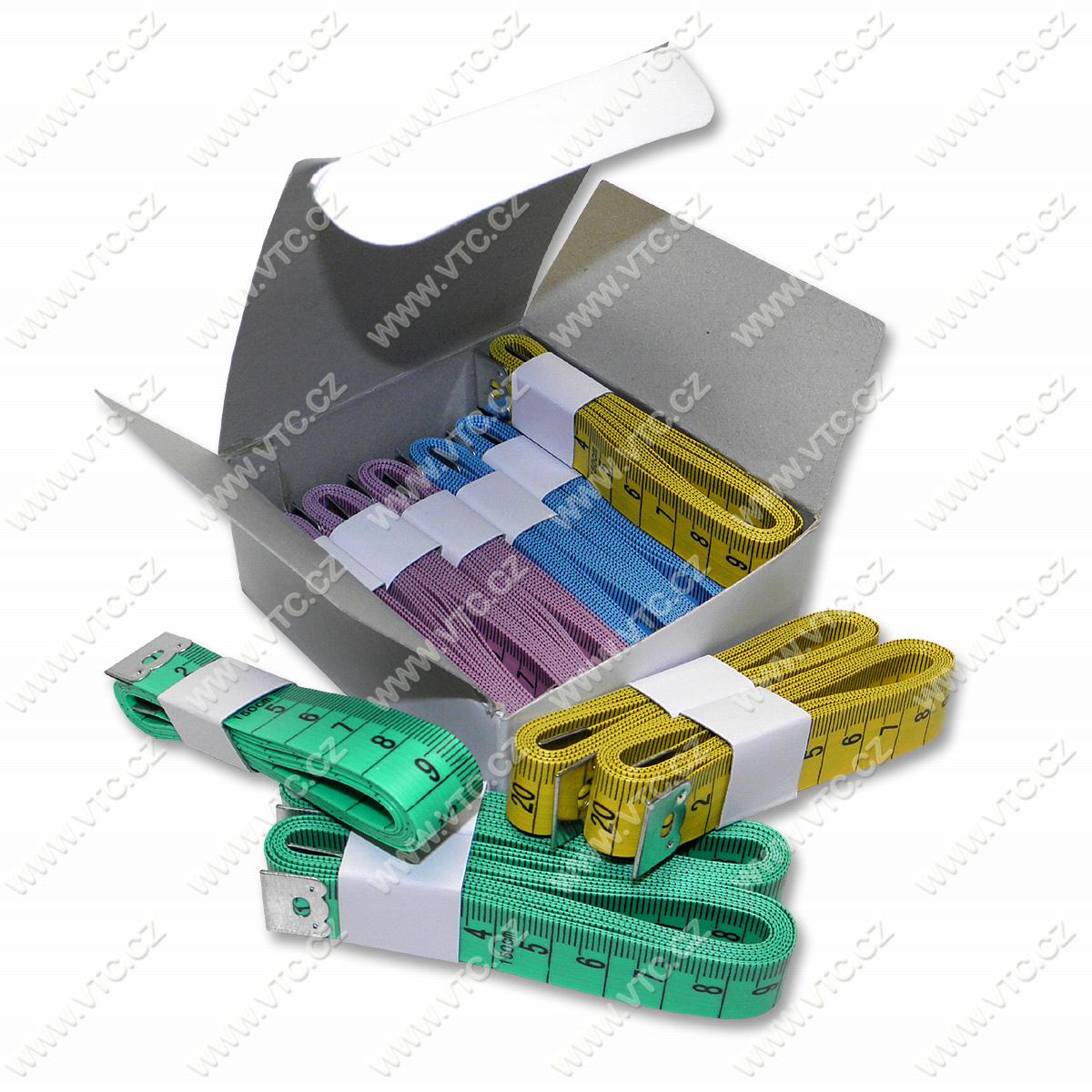 Plastic tailor's measure, 16 mm wide, 150 cm scale on both sides. 12 pcs/box, assorted colors: pink, blue, yellow, green, 3 pcs of each color. Price for 1 piece.
