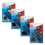 Mosazné průchodky s podložkou, průměr 4 mm, 50 ks na kartě s příslušenstvím včetně děrovacího přípravku. Možné aplikovat pomocí přiloženého přípravku a kladívka nebo kleští Vario 39448(39701) nebo trojnožky 39458 . Německý výrobek, cena za 1 blistr.
