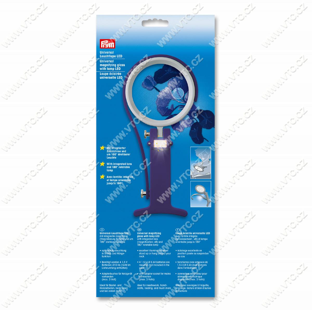 Univerzálna stolová lupa na vyšívanie s osvetlením, s integrovanou šošovkou ( zväčšenie:8x) a lampou otočnou o 180 stupňov. Lupu je možné postaviť alebo zavesiť. Osvetlenie vyžaduje 4ks batérií 1,5 V LR6 AA nie sú priložené). Čínsky výrobok, cena za 1 ks.