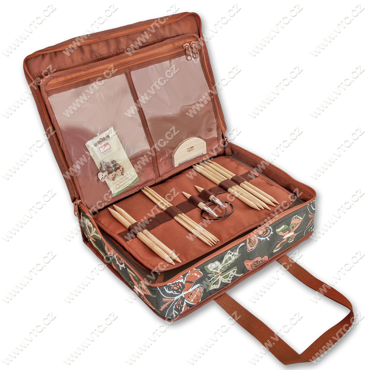 Univerzálna látková taška na ukladanie alebo transport šijacích a pletacích pomôcok - 8 vnútorných priehľadných vreciek, 12 elastických očiek a pevná ucha. Rozmery 34x26x9,5 cm. Filipínsky výrobok, cena za 1 ks.