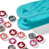 Kolekcia Prym LOVE. Stiskacie gombíky JERSEY 8 mm, 21 ks na karte, s návodom a príslušenstvom. Možno aplikovať pomocou priloženého prípravku a kladívka, klieští Vario 39448 alebo trojnožky 39458. Nemecký výrobok, cena za 1 kartu.
