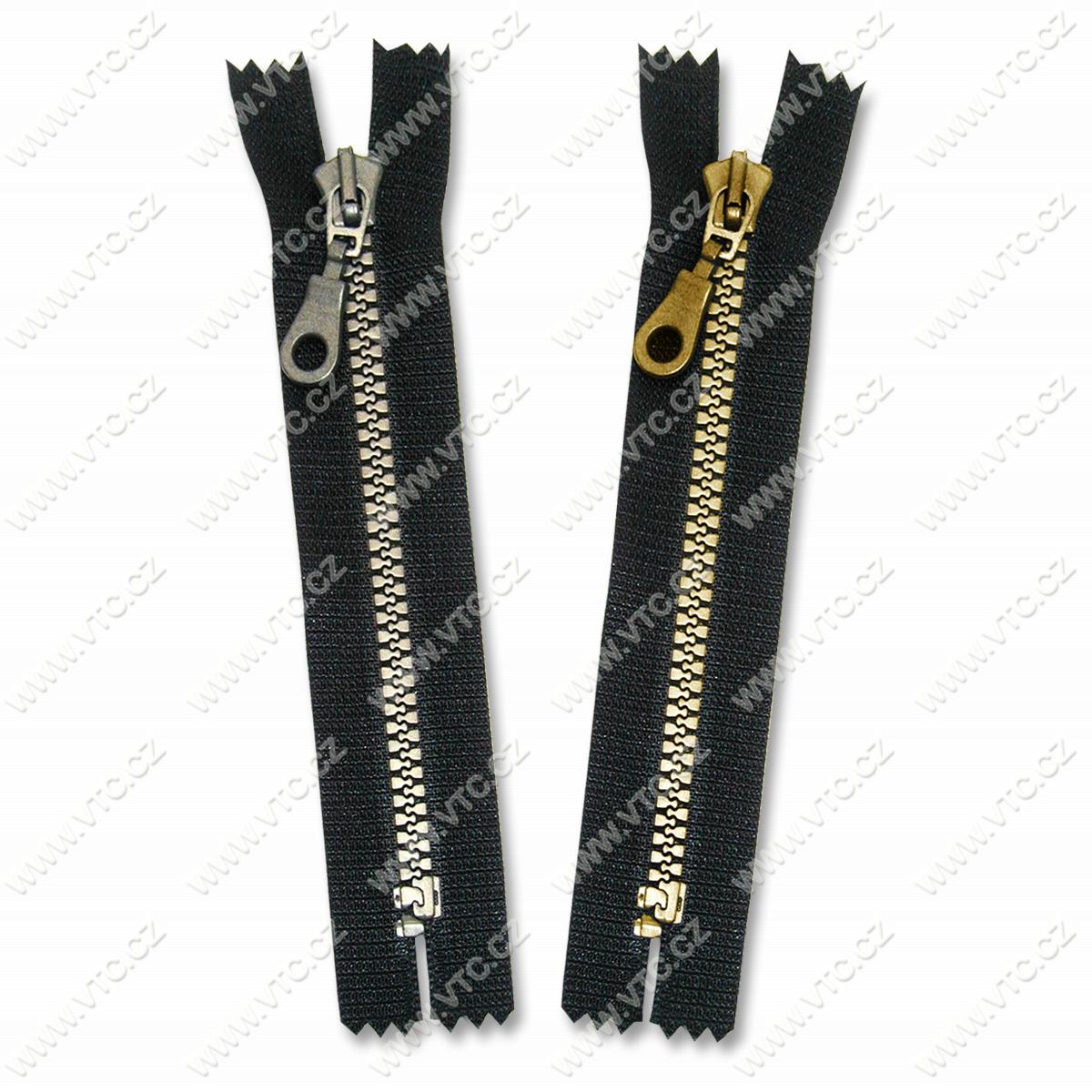 Plastový (kostený) zips pre vrchné ošatenie, kovový pigment, ozdobný bežec, šírka zubov 6 mm, nedeliteľný, cena za 1 ks, český výrobok.