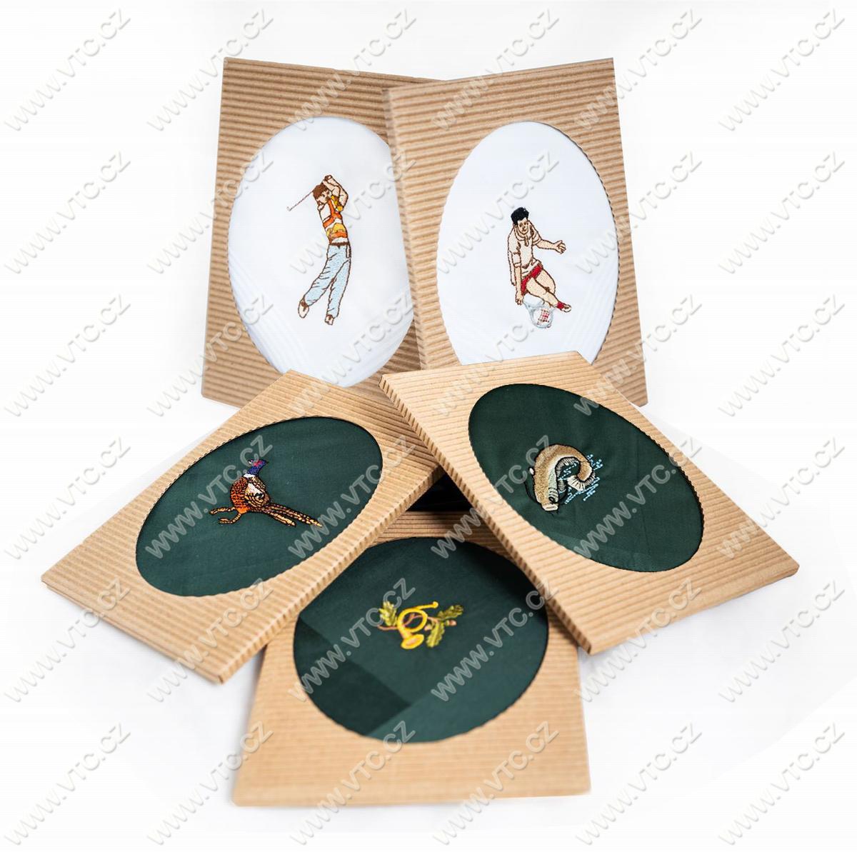 Pánska vreckovka, veľkosť cca 40x40 cm, s farebnou výšivkou (poľovník, rybár, golf, tenis), bavlna česaná, 1 ks v darčekovej eko krabičke. Český výrobok, cena za 1 krabičku.