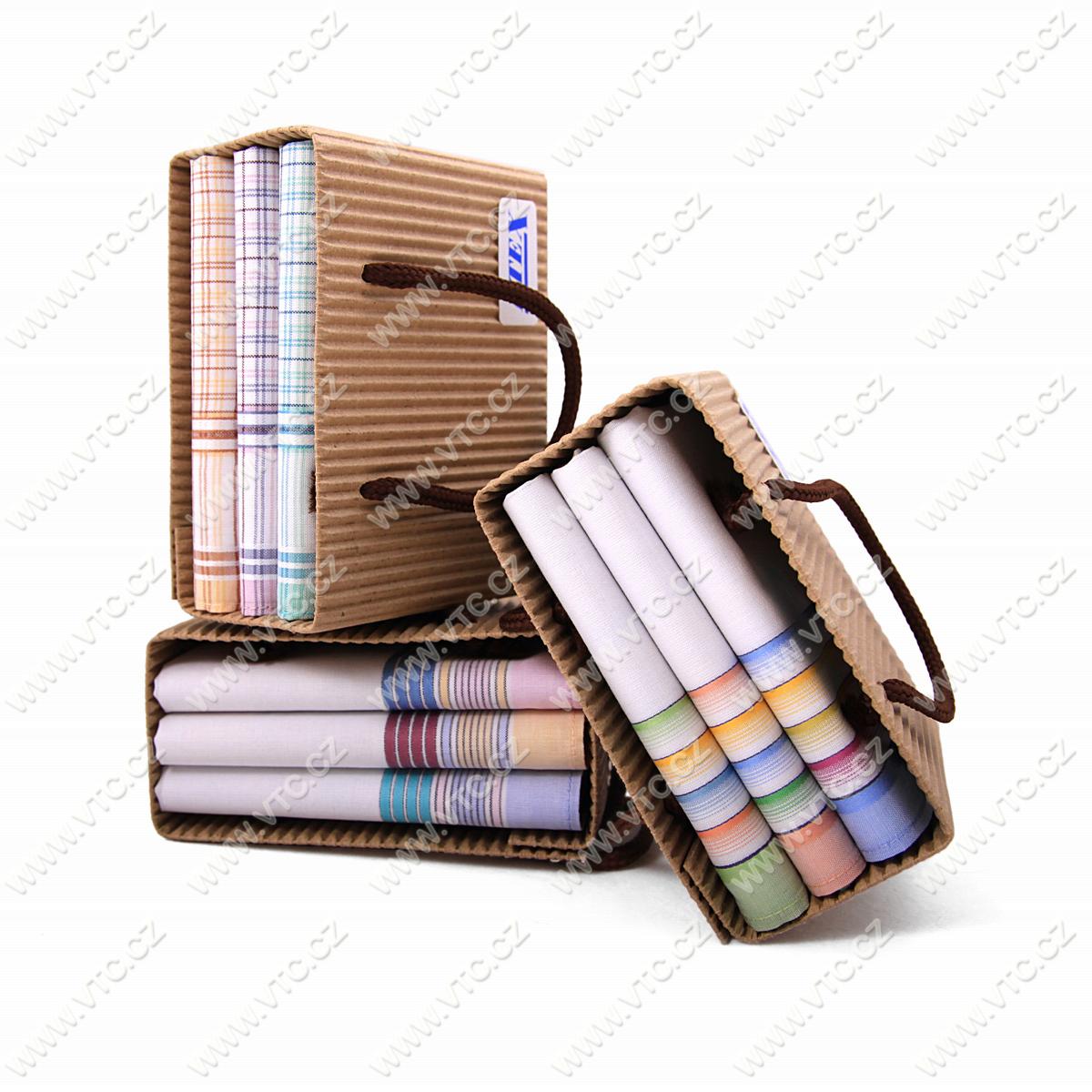 Dámska vreckovka, veľkosť cca 28x28 cm, rôznofarebná, česaná bavlna, 3 ks v darčekovej taštičke. Český výrobok, cena za 1 taštičku.