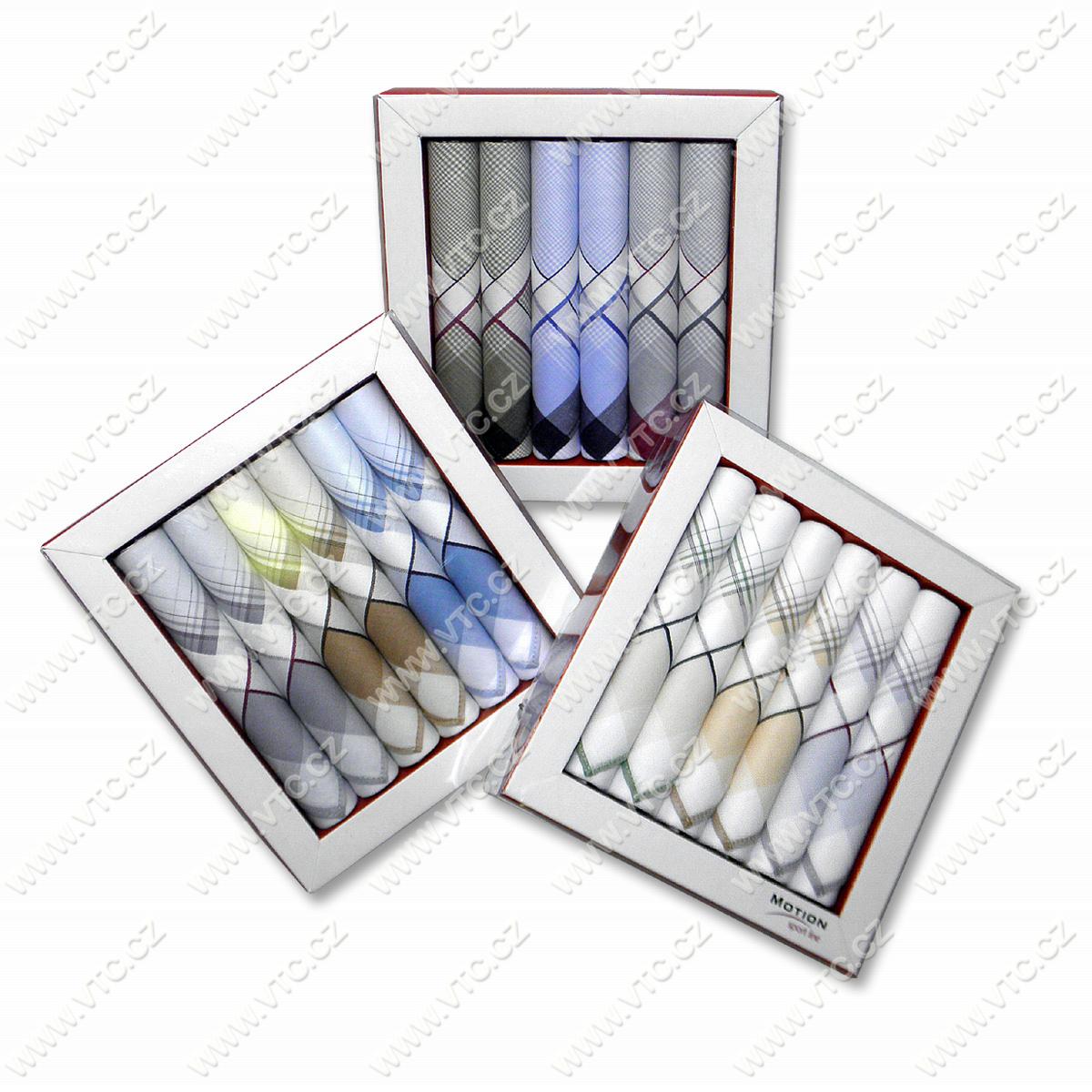 Pánska vreckovka, veľkosť 41x41 cm, polofarebná, bavlna česaná, 6 ks v krabičke. Český výrobok, cena za krabičku.