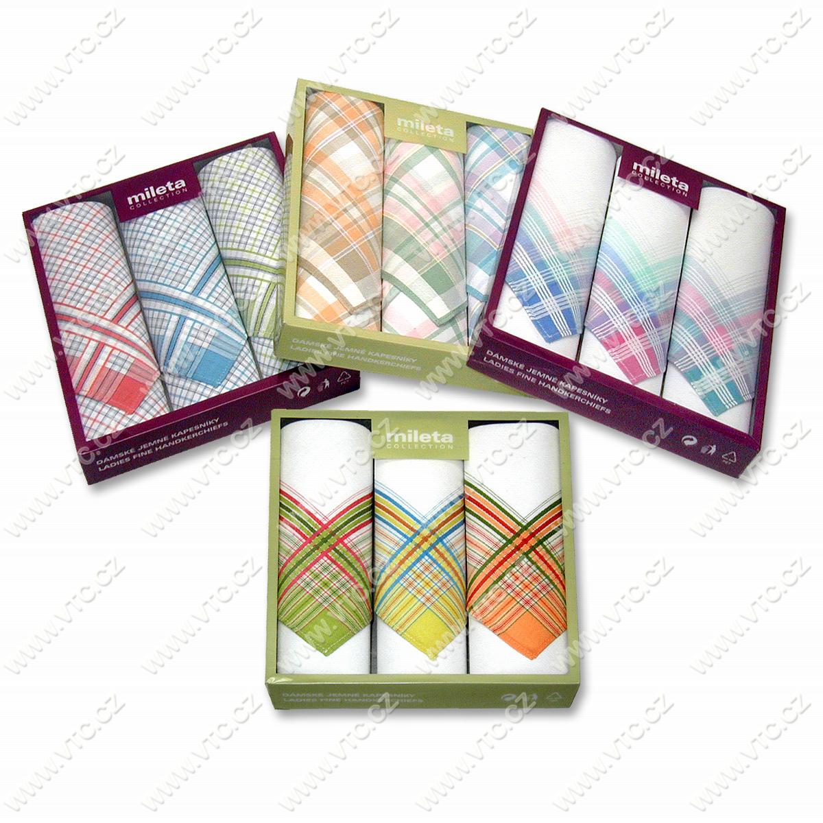 Dámska vreckovka, veľkosť 28x28 cm, polofarebná, bavlna česaná, 3 ks v krabičke. Český výrobok, cena za krabičku.
