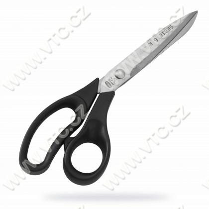 Vysoko kvalitné krajčírske nožnice s mikrozubom na jednej čepeli určené na spracovanie aramidových textílií a nití (Kevlar, para-aramid, sklolaminátové textílie, špeciálne nite), rukoväte z nylonu, dĺžka 24 cm (9,5 palcov). Taliansky výrobok, cena za 1 ks.