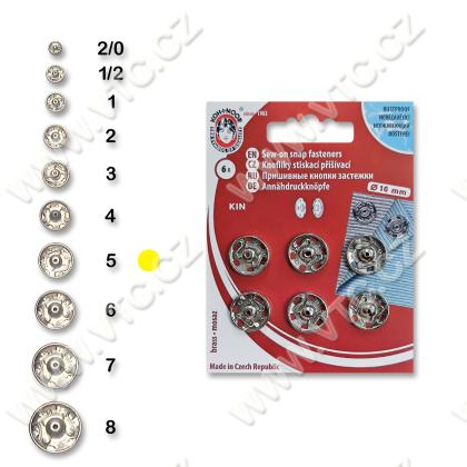 Stláčací gombík KIN, veľ.5 (14mm), 6 ks na karte. Český výrobok, cena za 1 kartu.