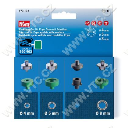 Sada nýtovacích a děrovacích přípravků pro průchodky Prym o průměru 4+5+8 mm. Kompatibilní s kleštěmi 39701(39448), lisem 39801 a trojnožkou 39485. Čínský výrobek, cena za 1 ks.