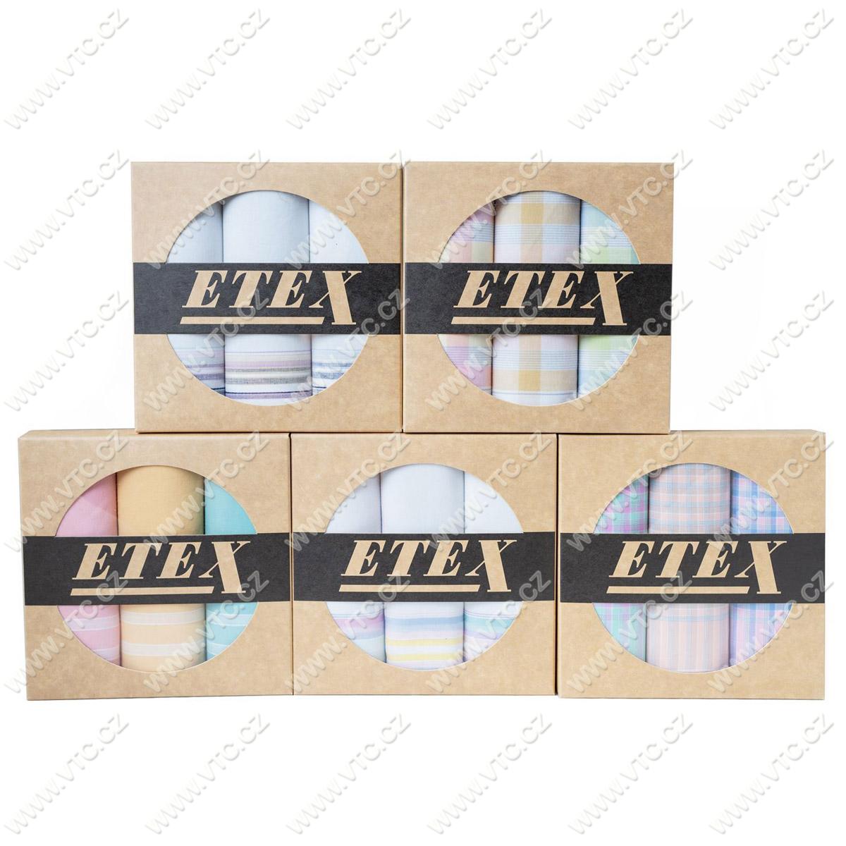 Dámský kapesník, velikost cca 28x28 cm, barevný, bavlna česaná, 3 ks v krabičce. Český výrobek, cena za krabičku.