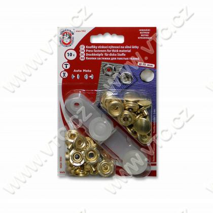 Nýtovací knoflíky AUTO-MOTO, vel.6 (15mm), 10 ks na kartě, včetně nýtovacího přípravku. Český výrobek, cena za 1 kartu.