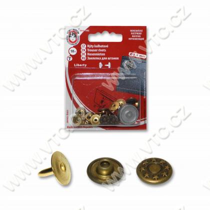 Kalhotové nýty, vel. 9,4 mm, staromosaz, 10 ks na kartě, včetně nýtovacího přípravku. Český výrobek, cena za 1 kartu.