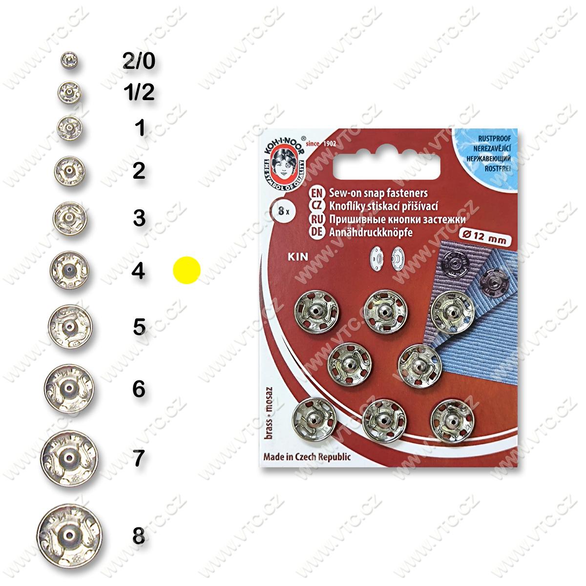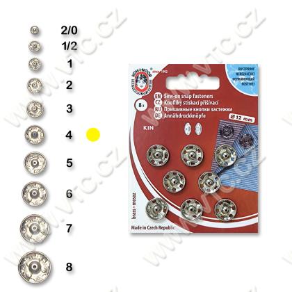 Stiskací knoflíky KIN, vel.4 (12mm), 8 ks na kartě. Český výrobek, cena za 1 kartu.
