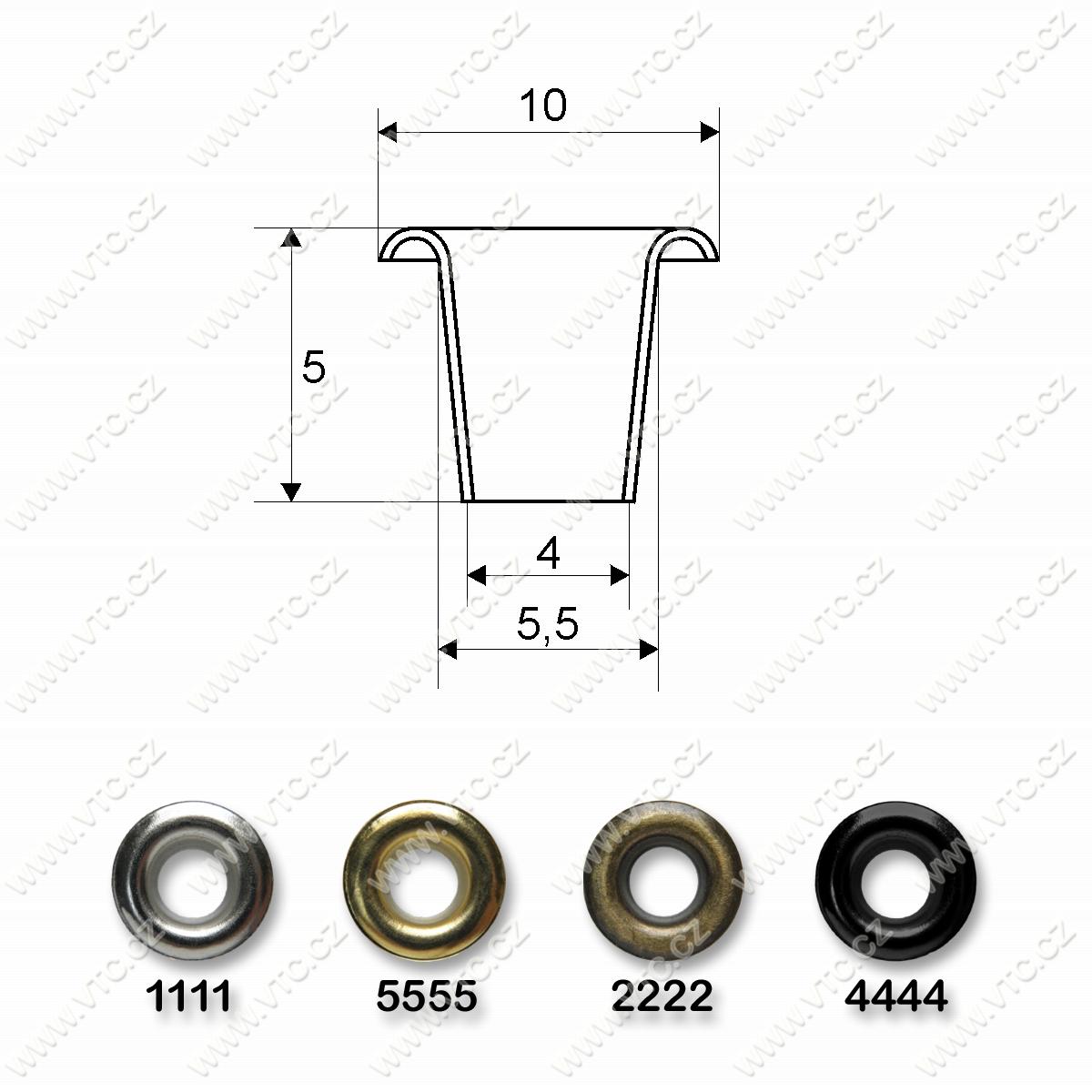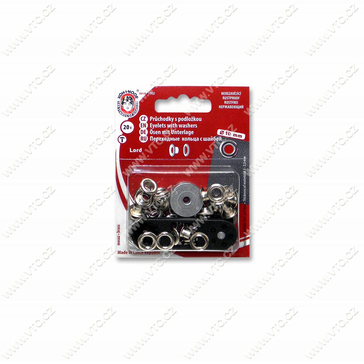 Oděvní průchodky, nerezavějící mosaz, rozměry 5,5x5x10 mm. Blistr obsahuje 20 ks + nýtovací i děrovací přípravek. Český výrobek, cena za 1 blistr.