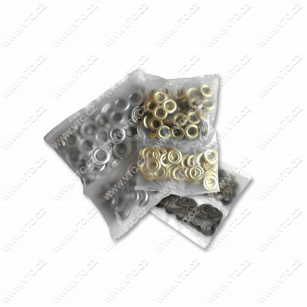 Průmyslové či plachtové průchodky, ocel + mosaz, rozměry 8x6x18 mm, 100 ks v balení. Balení neobsahuje nýtovací přípravky! Český výrobek, cena za 1 balení.